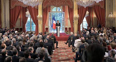 בנאום מדיניות החוץ הראשון שלו מאז בחירתו אמר נשיא צרפת: "יש לי מוניטין כידיד ישראל - וזה נכון". על איראן אמר: משבר הגרעין הוא החמור ביותר על סדר היום העולמי. דיפלומטיה עדיפה על פצצה איראנית או הפצצה באיראן. קרא ללוח זמנים לנסיגה אמריקנית מעיראק אבל אמר כי היחסים עם וושינגטון הדוקים. קרא לרוסיה לחדול מהתנהלותה הברוטלית במדיניות האנרגיה שלה עם שכנותיה