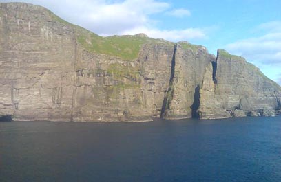 הצוקים מתנשאים לגובה של 300 מטר בקו אנכי מהים ועל זיזי הסלע מקננים הפאפינים. הקינים ניכרים בעשב הכהה הכחלחל יותר. הם לא התקרבו לסירה, אך שלל ציפורי ים חגו מסביב. הצעירים השיטו את הסירה בביטחון, מלאי טסטוסטרון ואדרנלין אל בין נקיקי הסלע והמערות בין הגלים שהתנפצו עליהם, וניתן היה לחוש בכוחו של האוקיינוס המכה באיים העקשניים האלה.