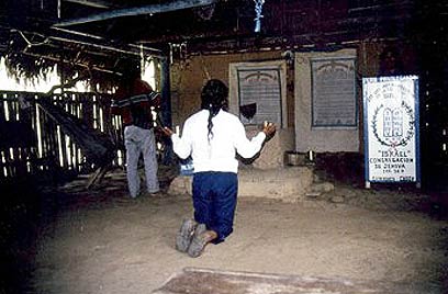 התמזל מזלנו להיות בבית המקדש בעת התפילה. כל הנוכחים, גברים עטורי זקן ופאות, נשים מכוסות ראש וילדים קטנים, שצימחו אף הם פאות ארוכות, שרו וקראו בתנ"ך ובברית החדשה. מראה סוריאליסטי לכל הדעות, כאילו לא היה די בשפע הגירויים הויזואליים שמסביב: ג'ונגל, קניון הררי, מפלי מים, צמחייה עבותה, תוכים צבעוניים, קופים, אינדיאנים. לכל אלו נוסף כעת גם בית מקדש. האזנו לתפילה, מנסים לזהות בילידים עטורי הצלב איזה שהוא זכר לאמונה יהודית, אך לא.