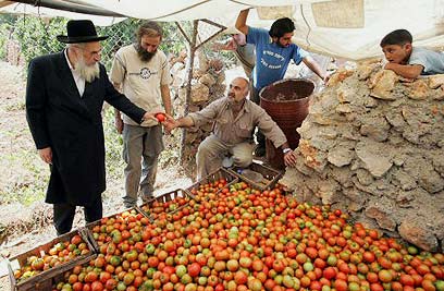 סוחר עגבניות ערבי במו"מ עם יהודי חרדי לקראת שנת השמיטה (AP)