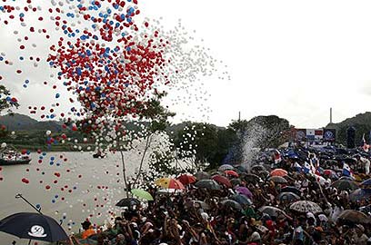 תושבי פנמה מניפים בלונים בטקס לציון תחילת הפרויקט (צילום AP)