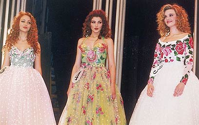 מתמודדת מספר 5, מ. שלנו, זכתה בתחרות בתואר נערת ישראל. במקרה שתהיתם, באותה שנה זכתה יאנה קלמן (מימין) בתואר מלכת היופי, ומיכל שטיבל (במרכז) ענדה את כתר "מלכת החן". (צילום: זיו קורן)