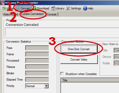 הורידו את התוכנה והתקינו אותה (ייתכן ובהמלך ההתקנה תתבקשו להוסיף את סביבת net. של מיקרוסופט). הפעילו את התוכנה ובחרו ב-Convert בחלק העליון, לאחר מכן בחרו ב-Current Conversion, ולחצו על One Click Convert. סמנו את הקבצים שאתם רוצים לצפות בהם ב-iPod ואשרו – התוכנה תתחיל בהמרה.