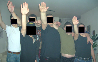 בטלפונים הניידים שלהם נמצאו מאות תמונות של הצדעה במועל יד. אחד החשודים אף נראה אוחז בידו את דגל ישראל קרוע. שני חשודים קיעקעו סמלים נאציים על גופם כגון סקרו דרייבר (להקה בריטית נאו-נאצית) וכן "הכוח הלבן" עם צלבי קרס וקעקועים של גדר תיל. בנוסף, קעקעו על אצבעותיהם את הספרות 88. הספרה 8 מייצגת את מיקומה של האות H, ולכן 88 = הייל היטלר.