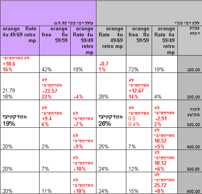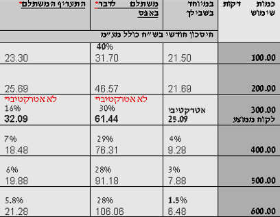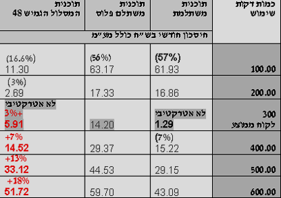 בטבלה המצורפת ניתן לראות, כי למעשה בשתיים משלוש תוכניות ללקוח הממוצע, שהוא למעשה מייצג את שוק הצרכנים, אין אטרקטיביות במעבר ובאחת מהתוכניות אין כדאיות במעבר כמעט לאף סוג של לקוח.