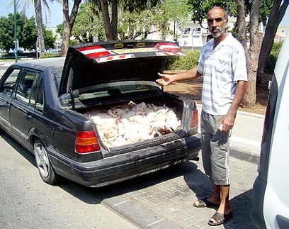 היום סמוך לשעה 10:00 עצרה ניידת משטרה שני כלי רכב חשודים לביקורת שגרתית ברחוב קיבוץ גלויות בתל אביב. השוטרים ביקשו מנהגי המכוניות לפתוח את תא המטען שלהן, ושם גילו למרבה הפתעתם מאות עופות שחוטים, שנשחטו ככל נראה על ידי פלסטינים ללא כל פיקוח רפואי.