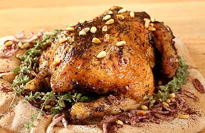 - כאשר העוף מוכן מניחים אותו על הפיתה, יוצקים מעליו מהרוטב שהצטבר בתחתית התבנית, מפזרים עוד סומאק, עלי אזוב טריים ואת הצנוברים ומגישים.