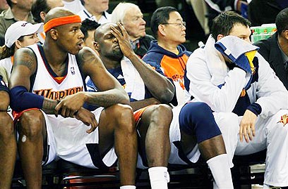 שאראס בפוזה מוכרת על הספסל של הווריורס (צילום: איי.פי)