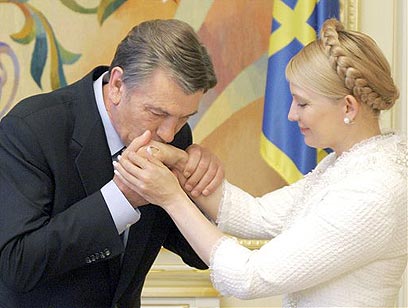 יושנקו מנשק את ידה של טימושנקו, בשבוע שעבר (צילום: AP)