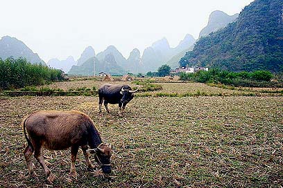 ככל שמדרימים מתחלפים הצבעים מצהוב-אפור לירוק רענן של איזור חקלאי דשן, ועמודי הגיר מתכסים בצמחיה סובטרופית צפופה. לעיני המבקר נפרש נוף של שדות אורז מוריקים תעלות מים צרות, נחלים ונהרות הממלאים את המשטחים שבין אצבעות הגיר. הנוף מוכר מחלק נכבד של הציורים הסיניים, בהם נראים חקלאים, עצים וסירות-דייגים על רקע של הרים מאורכים – ספק נטועים בקרקע, ספק מרחפים באוויר – הריה של גווילין.