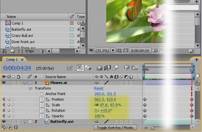נגרור את הקבצים לחלון הTimeline, השכבות יופיעו אחת מעל השניה. נפתח את המשולש הקטן משמאל לשם השכבה ונשנה את המאפיינים. בכל מקום בו רואים צלמית של שעון עצר ניתן לייצר אנימציה על ידי שימוש בשיטת נקודות מפתח - Keyframe. בפריים הראשון נלחץ על השעון בכדי להוסיף נקודת מפתח במאפייני Scale, Position, Rotation ו-Opacity.
