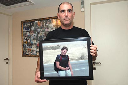 מוטי פנקס אוחז בתמונת בנו, ליר ז"ל (צילום: ירון ברנר)