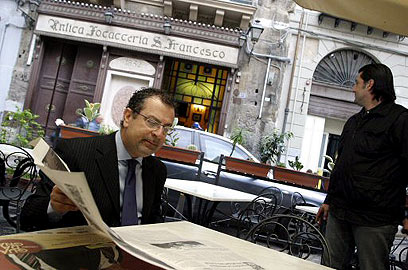 וינצ'נזו קונטיצ'לו על רקע מסעדת ה"פוקצ'ריה" בפלרמו (צילום: רויטרס)