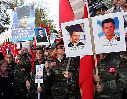 אלף בני אדם הפגינו באנקרה למען שחרור השבויים הטורקים (צילום: AP)