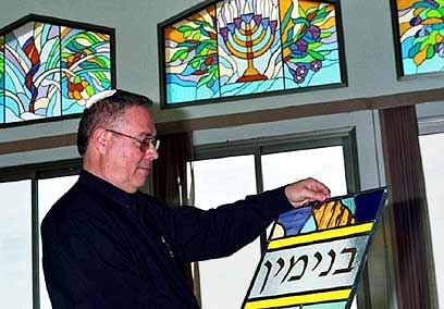 את הויטראז'ים תרם נחום עסיס בנו של רב בית הכנסת הרב אריה עסיס, אומן הויטראז'ים נבחר לאחר חיפוש מדוקדק: "חיפשתי אומן ויטראז'ים, אבל אף אחד מאלו שהציעו את עצמם לא הראה לי משהו שיכול היה להניח את דעתי, חיפשתי באינטרנט ומצאתי באתרים בחו"ל בתי כנסת מקושטים בויטראז'ים יפיפיים. התקשרתי בטלפון לאחד לבית כנסת בקנדה המעוטר בויטראז'ים שמצאו חן בעיניי והתברר לי שהאומן האחראי להם הוא מר ג'רמי לנגפורד והוא מתגורר לא רחוק ממני, בבני ברק. פניתי אליו מיידית והוא אחראי לייצורם של יצירות האמנות חלונות הויטראז' בבית הכנסת"