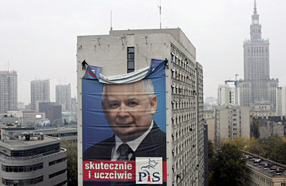 כרזת בחירות של קצ'ינסקי מורדת מבניין בוורשה (צילום: רויטרס)