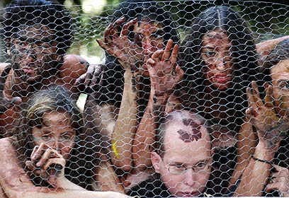 מיצג מחאה יוצא דופן התקיים היום (ב') בגן מאיר ובכיכר רבין בתל-אביב: עשרה פעילי עמותת בעלי החיים "אנונימוס", מעורטלים למחצה, הצטופפו במשאית קטנה כדי למחות נגד תעשיית הובלת הבקר החי מאוסטרליה לישראל.