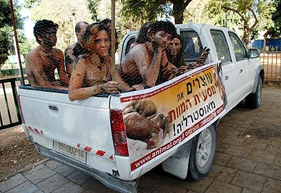 פעילי עמותת בעלי החיים "אנונימוס" הצטופפו עירומים למחצה במשאית שחלפה במרכז תל אביב, כדי למחות נגד הובלת בקר וצאן חיים לשחיטה בישראל. לדבריהם, בעלי החיים מועמסים בצפיפות על אוניות ובמשך כחודש, ללא מים ומזון ובתנאים קשים, מובלים לארץ. הפעילים קוראים למדינה לעצור את השיטה האכזרית. "זהו סבל לא לגיטימי"
