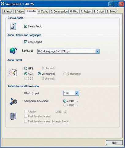 בחלון זה יש לקבוע את נתוני פס הקול של הסרט. כדאי לזכור כי בסרטי DVD, פס הקול מופרד מהוידאו, כך שאם תדלגו על קביעות אלה תוכלו לראות את הסרט, אך לא לשמוע כלום.