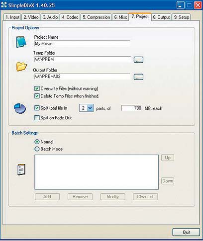לדוגמה, כאשר תירצו לשמור סרט באיכות גבוהה, תוכלו לקבוע את גודלו (בחלון Compression) ל-1350 מ"ב ולסמן את האפשרות Split total file in 2 parts of 700 MB each.