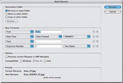 להפעלת התוכנה Bridge, בחרו את הפקודה Browse שבתפריט הקובץ, הציגו את תכולתו של התיק שאת שמות התמונות שבו תרצו לשנות והפעילו את הפקודה: Batch Rename שבתפריט הכלים (Tools). פקודה זו תציג חלון המחולק לארבעה חלקים: בחלקו עליון של החלון (Destination Folder), ניתן לבחור מה יעלה בגורלם של הקבצים לאחר ששמם הוחלף: ישארו במקומם, יועברו למיקום אחר או שיועתקו למיקום אחר.