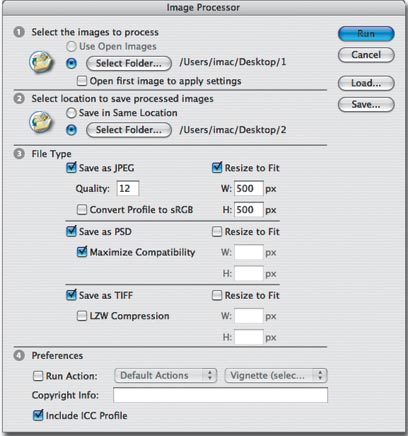 הנה פקודה שנעלמה מעיני רבים. הפעילו את הפקודה image Processor שבתפריט המשנה Script שבתפריט הקובץ (File). לאחר הפעלת הפקודה יוצג חלון שגם הוא, כמו הקודם מחולק לארבעה חלקים (שאגב, ממוספרים): באמצעות החלק הראשון בחלון ניתן לבחור את התיקייה בה ממוקמים הקבצים אותם רוצים להמיר. בחלק השני ניתן לקבוע היכן ישמרו הקבצים החדשים. כדאי לדעת שגם אם תקבעו שהקבצים החדשים ימוקמו באותה תיקייה (Save in Same Location), הפעולה לא "תדרוס" את הקבצים הישנים אלא תיצור עבור החדשים תיק חדש.