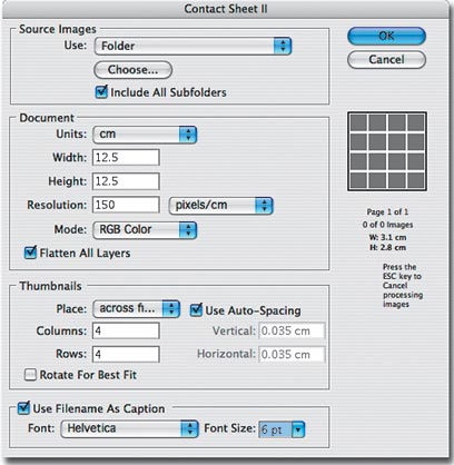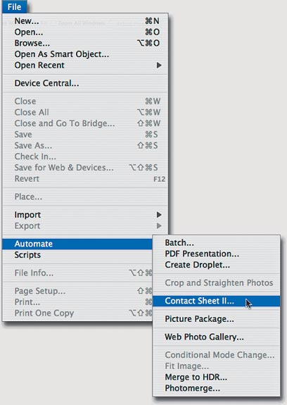 בעוד כמה שנים מישהו יחקור את השפעתה של המהפיכה הדיגיטלית על עולם הצילום, ויגיע למסקנות נחרצות האם היא היתה טובה לצלמים או לא. על שתי עובדות כבר כולם מסכימים: האחת, שאנחנו מצלמים הרבה יותר (יותר אנשים מצלמים יותר תמונות), השנייה, רובנו מדפיסים לעיתים רק את התמונות הנבחרות ואת שאר התמונות שומרים במחשב. בדיוק מהסיבה הזו כדאי להכיר פקודה פשוטה וחכמה באמצעותה ניתן להדפיס תמונות מוקטנות של כל התיקייה, ואף ליצור ספרון קטן שיתאים ל-DVD שעליו צרבנו את התמונות לגיבוי. שמה של הפקודה Contact Sheet 2 והיא נמצאת בתפריט המשנה Automate שבתפריט הקובץ (File).