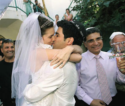 טל ונעם ביום חתונתם. הובילה אותו (צילום: רפי דלויה)