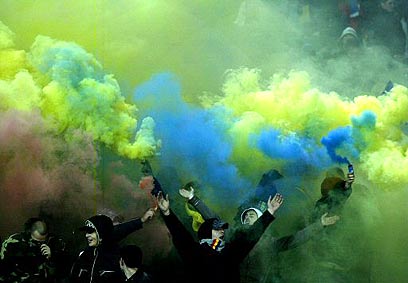 אוהדי נבחרת רומניה מכוסים בעשן צהוב-כחול-אדום בבולגריה (צילום: איי פי)