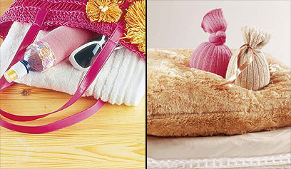 משמאל: גרב על בקבוק השתייה שבתיק ימנע את הרטבת שאר החפצים (שרה פרי, גבעתיים). עצה מצויינת נוספת: ממלאים בקבוק פלסטיק במים, עוטפים בגרב, קושרים ושומרים במקפיא. נחבלתם? מוציאים ומצמידים למכה, והגרב מונע כוויות קור. (ריבי פיטשון, הרצליה)