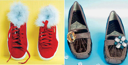 משמאל: תראו איך פס דק של פרווה סינתטית משדרג את נעלי הספורט לבלי הכר. מדביקים בדבק בד פס דק של פרווה סינתטית צבעונית (להשיג בחנויות פרווה ובדים) סביב פתח של נעל ספורט, כך ששני-שלישים מהפרווה יישארו בתוך הנעל והיתר יבלוט החוצה.