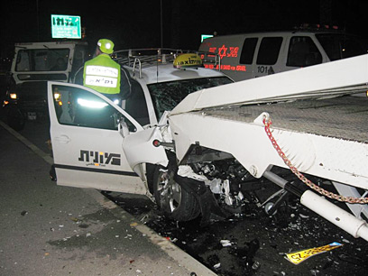 גרר מפנה את המונית ממקום התאונה בנתב"ג (צילום: מנדי חביב, זק"א)