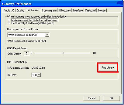בסרגל העליון של התוכנה יש לבחור ב-Edit ומשם לגשת ל-Preferences. יש לבחור בלשונית File formats ולמטה ב-MP3 export setup יש ללחוץ על כפתור ה- Find library ולסמן את קובץ ה-DLL שהורדנו בסעיף הקודם.
