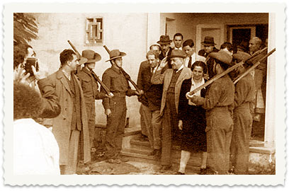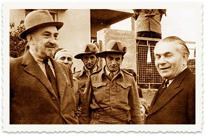 10. פרופ' חיים וייצמן משמאל, בליווי שומרי ראש בתלבושת נוטרים. טבריה, 1942. הנוטר האחורי הוא עקיבא אופנבך, בעלה של ליה, שהיה ביחידת השוטרים שאבטחה את הנשיא הראשון בתקופת הנוטרות של טרום המדינה