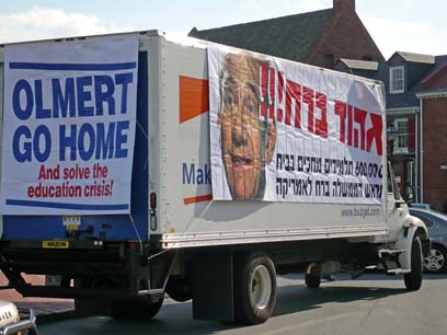 בזמן שאולמרט נאם, שוטטה בעיירה משאית עם שלט מחאה ענק: "600 אלף תלמידים בבית - וראש הממשלה ברח לאמריקה". מפגינה באנאפוליס: מרגישה שחצינו קו אדום
