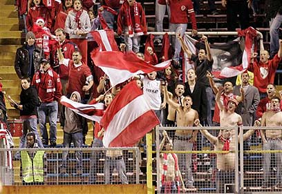 אוהדי הפועל ת"א. לא יוכלו לצפות במשחק בוולפסון (צילום: איי פי)
