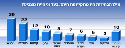 לפי סקר שערך מכון "דחף" עבור ידיעות אחרונות, אם הבחירות היו מתקיימות היום - הליכוד היה מקבל 29 מנדטים, העבודה 22 וקדימה 12. התמיכה בליכוד ובקדימה גדלה, ואילו ברק סופג מכה. הגמלאים נמחקים, והירוקים בפנים