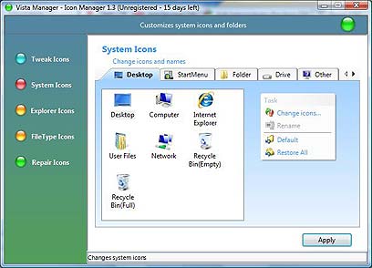 Vista Manager עולה על כמעט כל מה שאפשר למצוא בתחום. היא תאפשר לכם להחליף אייקונים ליישומים ותיקיות, לערוך את תפריטי הקליק-הימני (Context Menus), להיפטר ממודולי תוכנה מיותרים שמיקרוסופט מתעקשת לדחוף לכם, לבטל סלקטיבית מרכיבים שונים של ממשק Aero ואפילו לערוך את נתוני ה-OEM ששתל היצרן, ולהחליף את הלוגו שלו בכל תמונה שתבחרו. לא פחות חשוב: היא תאפשר לכם, בכל שלב, לשחזר את כל ברירות המחדל כדי לתקן את מה שקילקלתם.