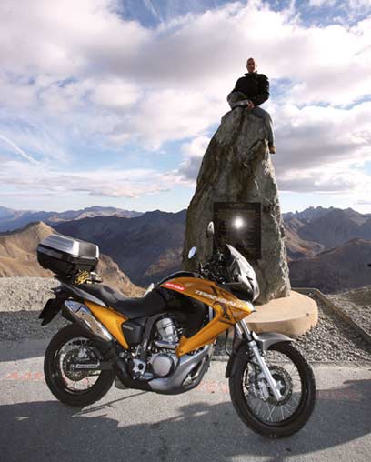 בלונדינית קומפקטית עם מבטא אוסטרלי ניגשת אלי ומספרת שקוראים לה טשה. אנחנו עומדים במרפסת של אולם הכנסים והאירועים במלון במונקו; בפנים מכריזים על פתיחת אירוע ההשקה של ההונדה טראנסאלפ החדש, ועיתונאי רכב מכל רחבי אירופה שותים יין ומכרסמים מזון מיקרוסקופי. בחוץ קר, וטשה - שבאה להחתים אותי על כמה טפסים - מסבירה לי שמחר בבוקר יחכה לי בכניסה למלון אופנוע מצויד בג'י.פי.אס, ושמתישהו אחרי הצהריים אני אמור להגיע לפס הגבוה ביותר באלפים. קול דה לה בונה, היא ציינה את שמו בהדרת כבוד.