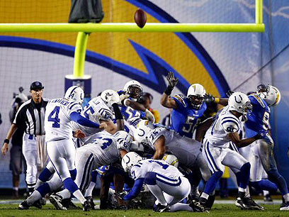 הקיקר אדם וינאטיירי מדגים בעיטה לשער שדה עבור הקולטס (רויטרס)