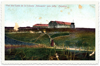 14. גלויה של צילום (נצבע ביד) ובו היקב ברחובות לפני מלחמת העולם הראשונה. גלויות אלו הודפסו בחו"ל והיו מרובות בשגיאות כתיב, בהוצאות "פלשתין מודרן" (תודה לירי רימון על הזיהוי).