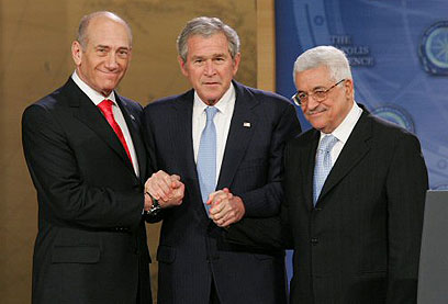 ספק גלוי בסיכוי: אבו-מאזן, בוש ואולמרט בוועידת אנאפוליס (צילום: AFP)