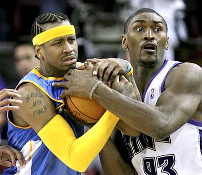 רון ארטסט ואלן אייברסון, במאבק על כדור כתום אחד (צילום: איי פי)