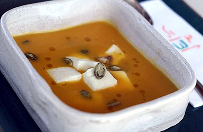 - מסננים את המרק דרך מסננת דקה ומוסיפים את השמנת מתבלים במלח ופלפל לפי הטעם. בהגשה מניחים כמה קוביות גבינת חלומי בכל קערה, יוצקים את המרק כשהוא חם מאד, מזלפים מעט שמן זית ומקשטים בגרעיני חמניות מעל.