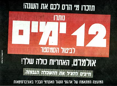 "תזכרו מי הרס לכם את השנה". זה נוסח המודעות בקמפיין מתוזמר ומתוזמן שבו פצחו היום (ד') ארגוני הסגל האקדמי הבכיר. במודעות שפורסמו בעיתונים היומיים תוקף הסגל הבכיר באקדמיה את בקשת צווי מניעה, ומזהיר: "נותרו 12 ימים לביטול הסמסטר. אולמרט, האחריות כולה שלך". אתמול נכנסה השביתה ליומה ה-73, והפכה להיות השביתה הארוכה בהיסטוריה של האוניברסיטאות במדינת ישראל. היא שברה את שיאה של שביתה אחרת - גם היא של המרצים - שנערכה לפני למעלה מעשור.