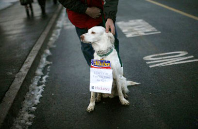 כלבו של תומך הקאבי עם שלט: "תוכל להצביע במקומי?" (צילום: רויטרס)