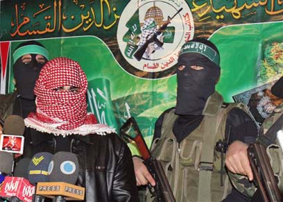 חמושים אנשי הזרוע הצבאית של חמאס, אמש בעזה (צילום: AP)