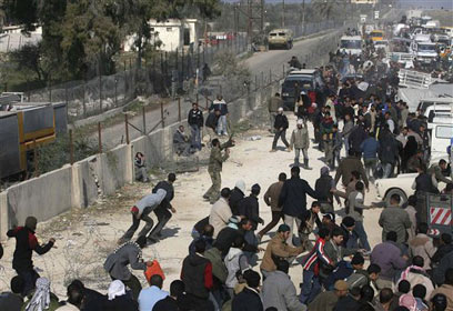 פלסטינים מתעמתים עם שוטרים מצרים בגבול, אתמול (צילום: AP)