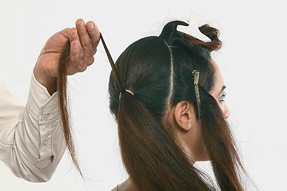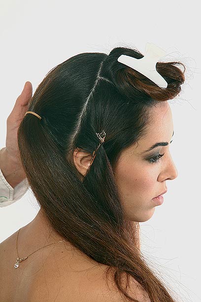 4. לוקחים את אחת מקווצות השיער הצדדיות ומותחים אותה לאחור