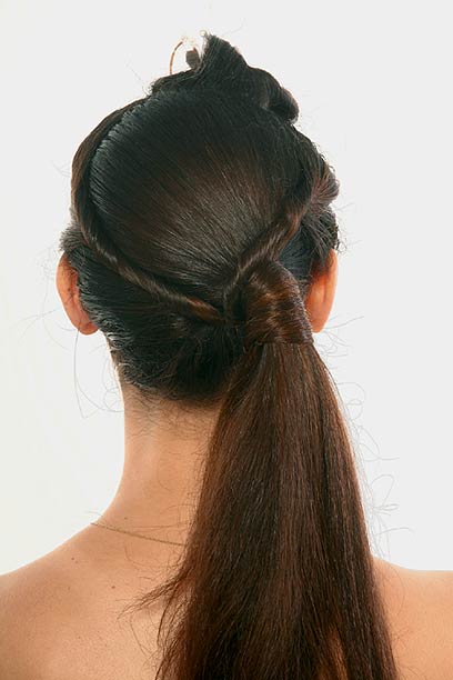 8. לאחר מכן חוזרים על אותה הפעולה עם קווצת השיער של הקודקוד. מלפפים אותה סביב עצמה, מותחים לאחור. או הצדה (תלוי בהעדפה)